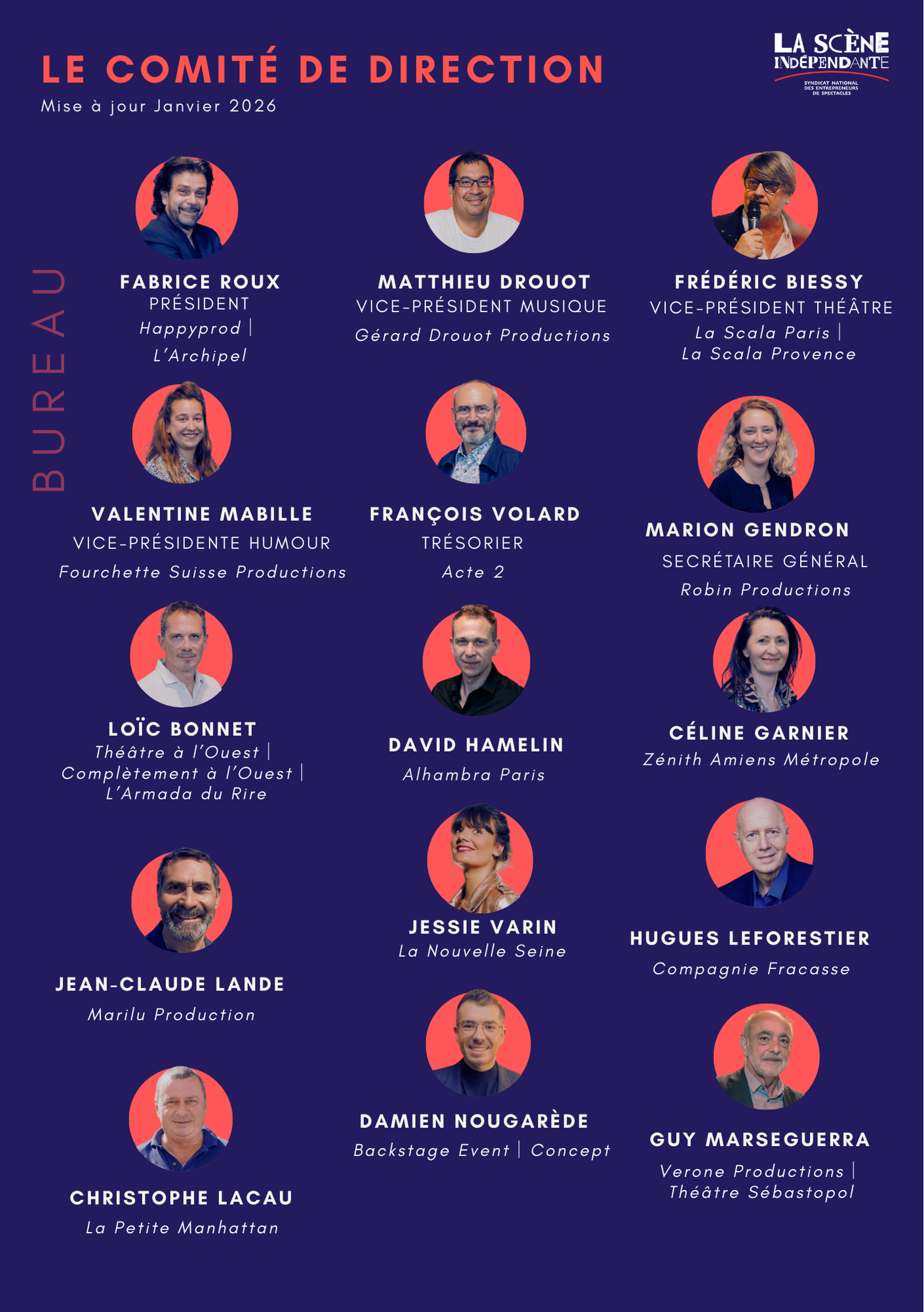 LA SCÈNE INDÉPENDANTE est animée par un Comité de Direction. Chaque membre du Comité, élu, est représentatif d'un domaine d'activité artistique : théâtre, musique, humour, cirque, danse...